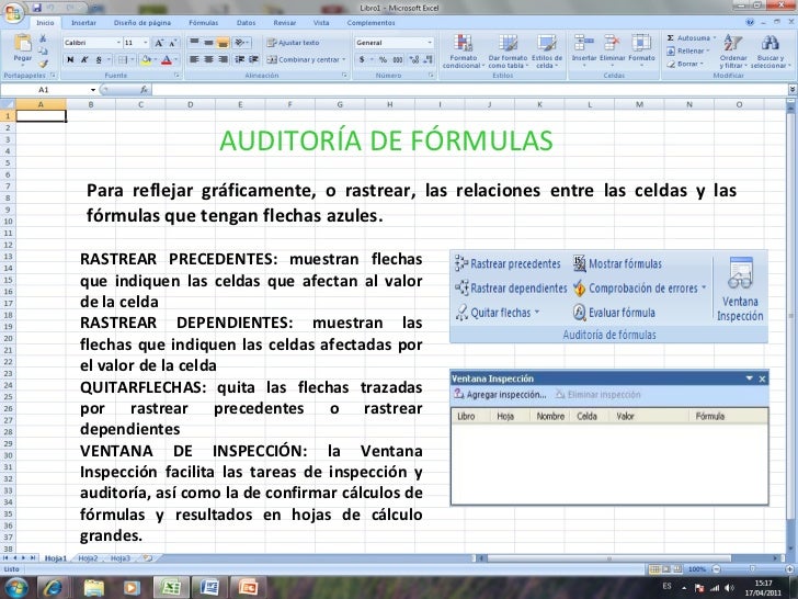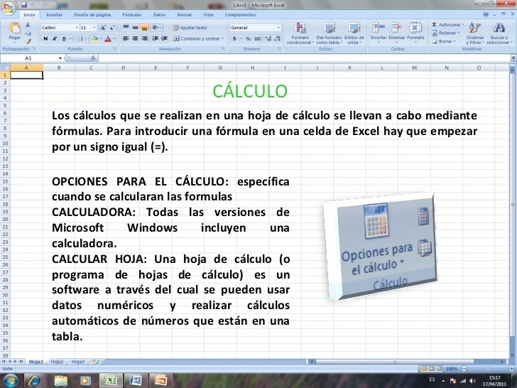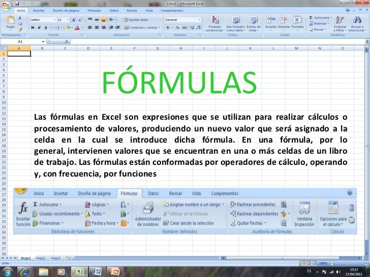 Las fórmulas calculan los valores en un orden específico. Las fórmulas de Excel siempre comienzan por un signo igual (=). Excel interpreta los caracteres detrás del signo igual como una fórmula. Tras el signo igual están los elementos que se van a calcular (los operandos); por ejemplo, constantes o referencias a celdas. Estos se encuentran separados por operadores de cálculo. Excel calcula la fórmula de izquierda a derecha, según el orden específico de cada operador de la fórmula.